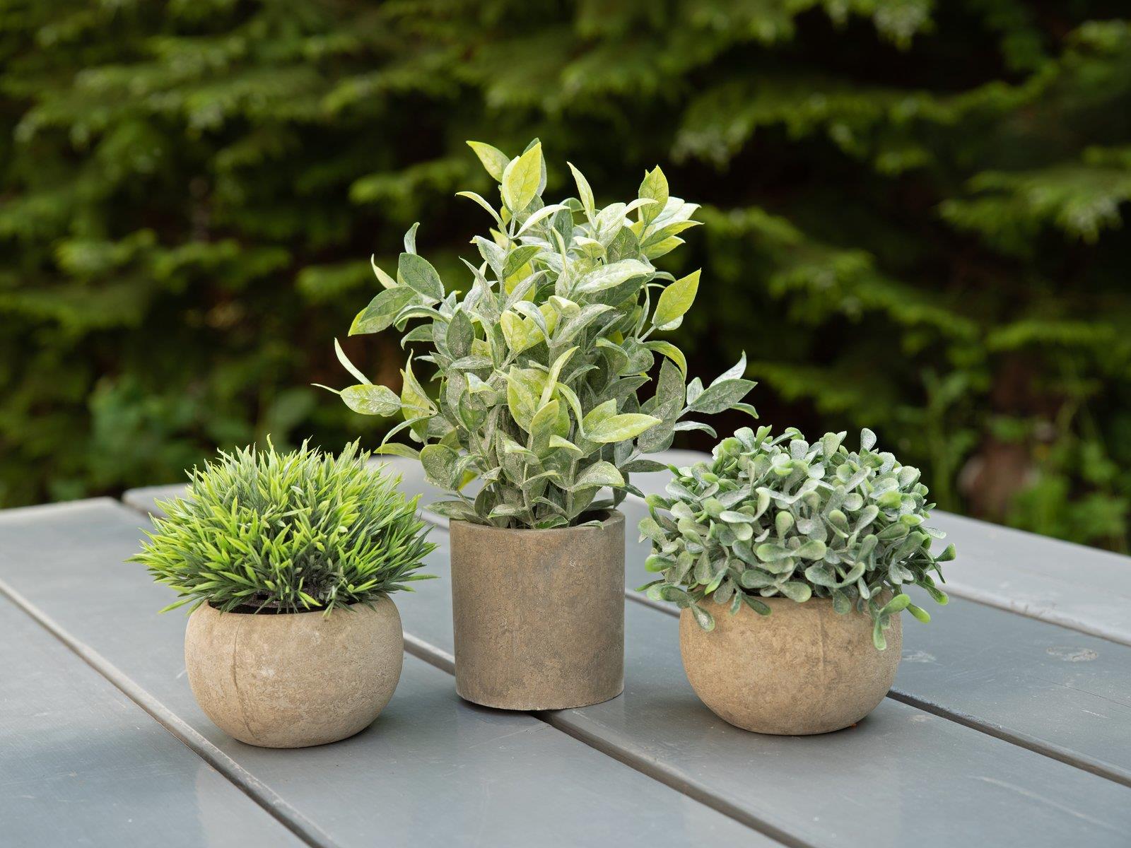 Das Tischpflanzenset von Europalms ist mit seinem klaren Design die perfekte Ergänzung zu jedem Dekorations- und Einrichtungsstil. Mit ihm lassen sich schnell und unkompliziert grüne Akzente setzen: ideal für Regale, Fensterbank, Schreibtisch oder als Tisch- und Thekendekoration.Die drei kleinen Topfpflanzen unterscheiden sich in Farbton und Struktur. Während Halme und Blätter aus hochwertigem PE gefertigt sind, wurden die Übertöpfe in Beton-Optik aus wiederverwendetem Zellstoff gefertigt und sind somit besonders nachhaltig. Sie eignen sich somit perfekt für dauerhafte Pflanzendekorationen, auch wenn nur wenig Platz oder keine Zeit für eine aufwendige Pflege zur Verfügung steht.(Bitte beachten: durch die Verarbeitung von Zellstoff sollten die Töpfe von Wasser ferngehalten werden und in Außenbereichen auch nicht im Regen stehen.)